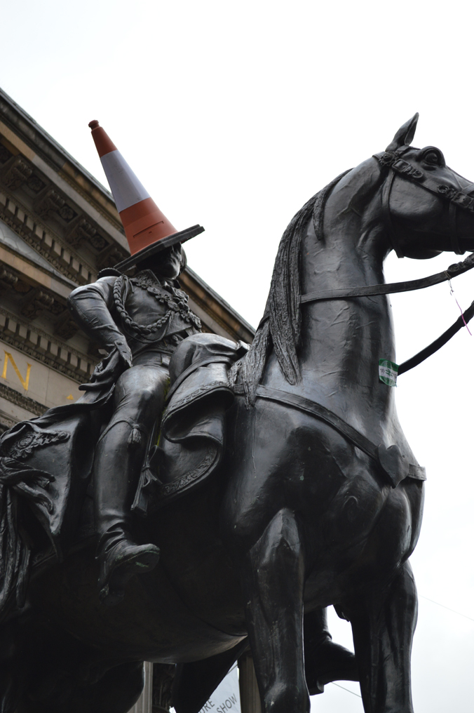 You might need to take a double look at this statue outside the Gallery of Modern Art on Queen Street, but the hat is a traffic cone. Rumor says that students every night come and throw a traffic cone in and police take it down every morning – I think it’s now permanent.