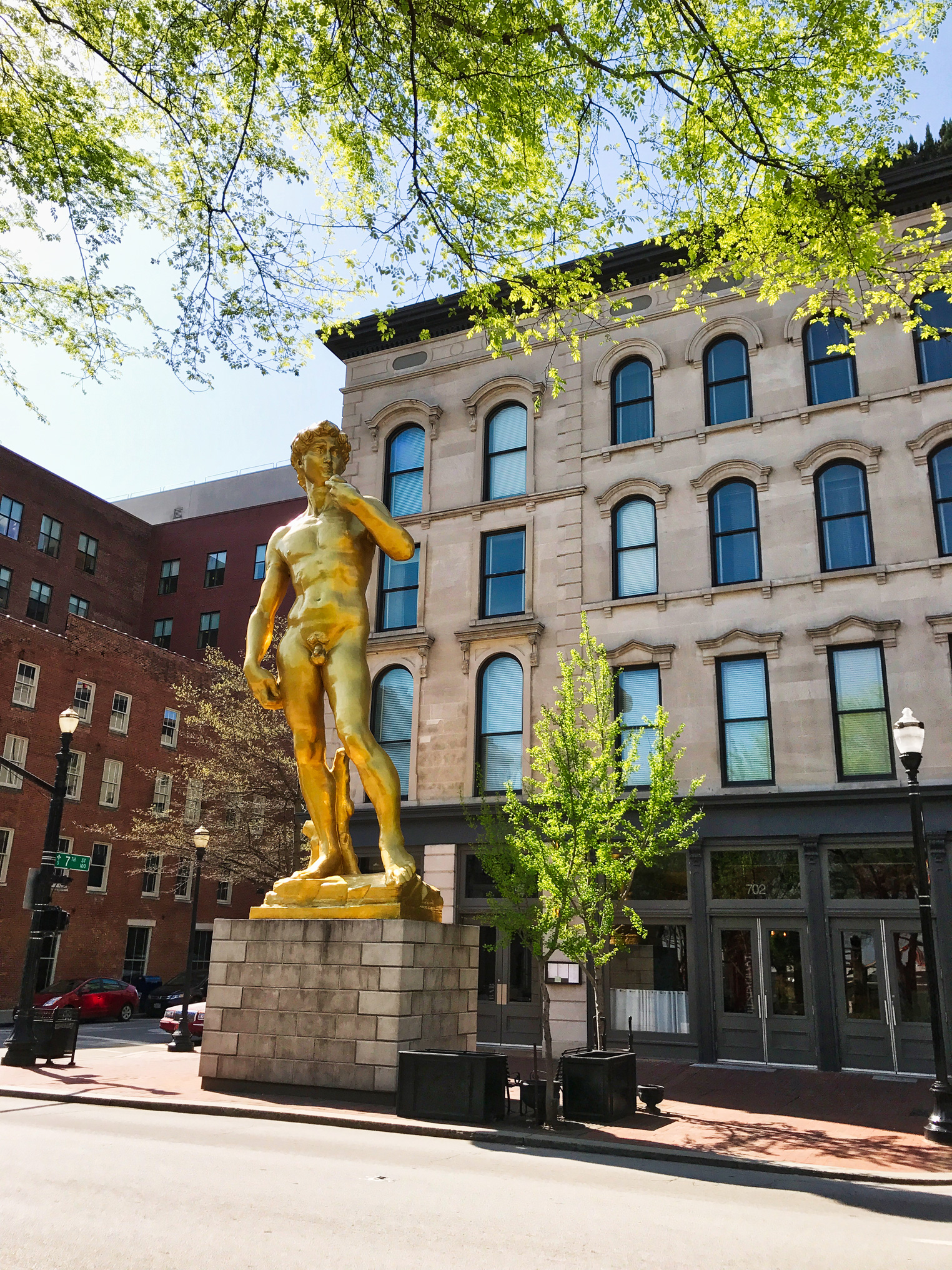 It is unmistakable to miss the 21c Museum Hotel in Louisville while driving by the historic west main street. Right outside its doors is a super-sized golden replica of Michelangelo’s David by artist Serkan Özkaya. It’s the first glimpse that tells you you’re in the right place for one of the best hotel museum concepts we’ve ever stayed at.