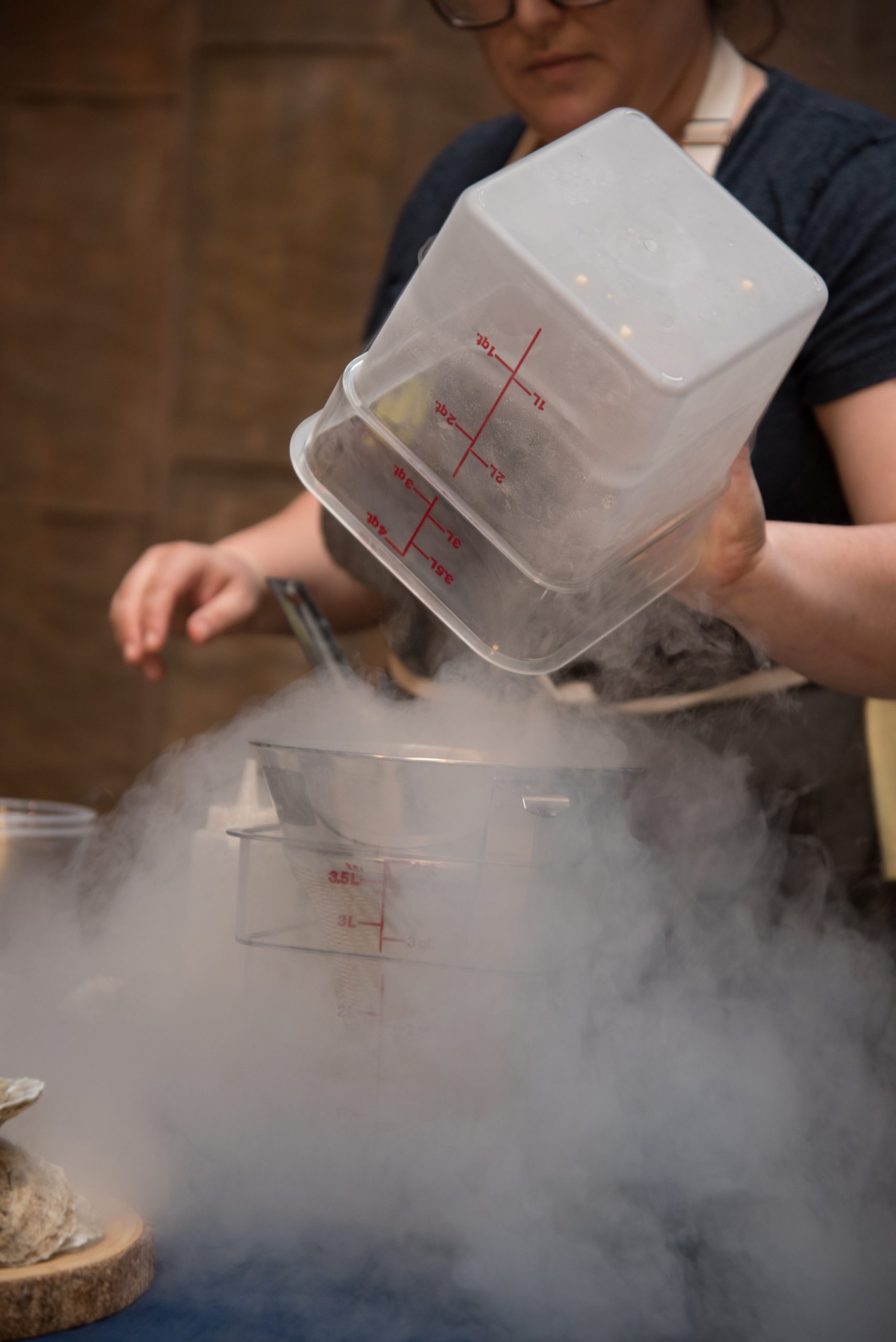 - Set up a water bath to 82 C. Cryo-vac lamb belly in sous vide bags and sous vide at 82 C for 12 hours. Remove, reserve and strain the liquid from the bag and cool completely under refrigeration. Meanwhile, reduce reserved liquid by 1/3 and use to glaze finished belly.
